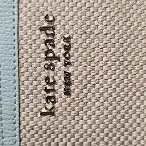 Chic Kate Spade tote with a tan body and navy trim. Stylish and versatile for any outfit.