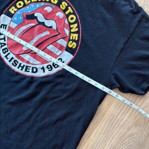 Black t-shirt featuring the Rolling Stones logo. Bold red and white design.