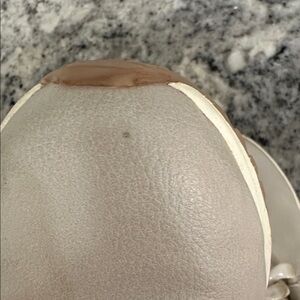 Step out in style with these cream/taupe slip-on shoes, featuring a chic chain detail. Perfect for any occasion, these shoes offer both comfort and sophistication. These are adorable and versatile. The only flaw is a small gray spect on the front of the left shoe as pictured.