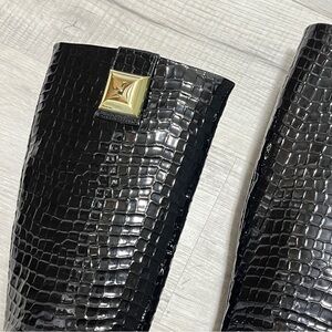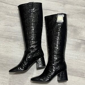 Step out in style with these chic black croc-embossed knee-high boots. Perfect for any occasion, these boots offer a sophisticated look with a comfortable fit.