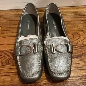 NWOT St John’s Bay Silver Leather Flats Size 9 with silver buckle design. Square toe. No flaws. Genuine leather.