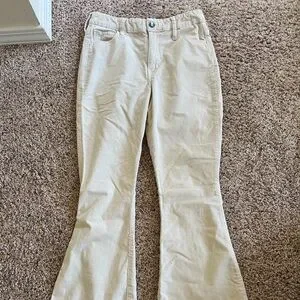 Chic high-rise flare pants in cream. Ideal for versatile styling. Size 5R 27W
