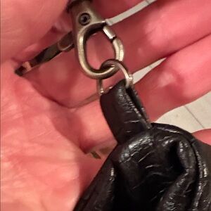 Chic black shoulder bag with textured finish. Features metallic accents and signature logo. Ideal for stylish outings.