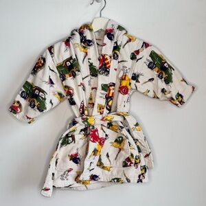 Kids bath robe with ties and front pockets. Construction, concrete truck themed.