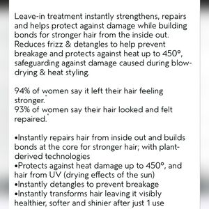 Leave-in treatment instantly strengthens, repairs and helps protect against damage while building bonds for stronger hair from the inside out. Reduces frizz & detangles to help prevent breakage and protects against heat up to 450°, safeguarding against damage caused during blow-drying & heat styling.