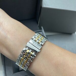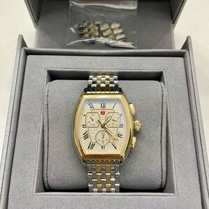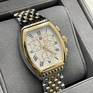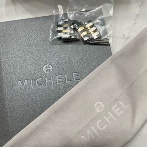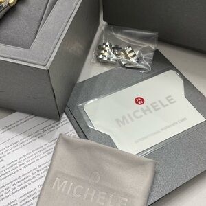 Michele Releve Two Tone Gold & Silver Watch MWW19A000029 in excellent pre-owned condition. I rarely wore it since I’ve several other watches. Retailed $1195 plus tax ($1293). Elegant gold and silver chronograph watch with a classic design. Features a detailed dial with Roman numerals. Includes extra links, price tags, box, cleaning cloth, manual and warranty card as seen on the photos. Needs a battery replacement. You don’t see this style a lot. Get this beautiful rare find for yourself or someone special! From smoke free pet free home. Free authentication by Poshmark.