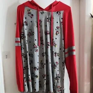 Charming Disney top with vibrant red sleeves. Soft gray fabric with a cozy hood.