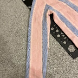 This beautiful and soft 100% cashmere cardigan has a three-button closure, jacquard three color striped horizontal knit, and self finishing at the hems. Slightly oversized for a comfortable fit. In excellent condition.