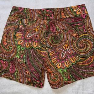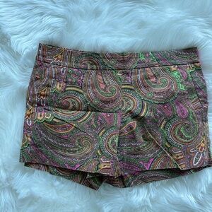 These high-waist shorts from J. Crew feature a vibrant mix of green and pink hues, perfect for adding a pop of color to your summer wardrobe. The structured design ensures a flattering fit, while the bold paisley pattern offers a stylish and eye-catching look. Excellent used condition worn very minimally. These are absolutely adorable.