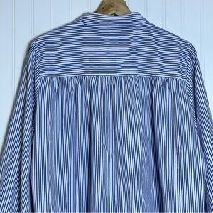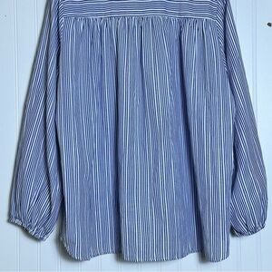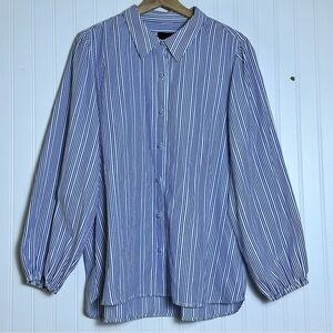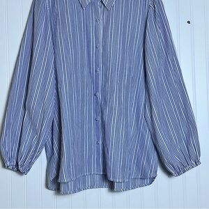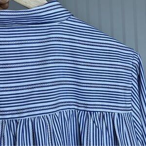 Elegant button-down with navy and white stripes, puff sleeves, collar neckline Long sleeves Unlined Elastic cuff Polyester/cotton Ideal for any occasion.