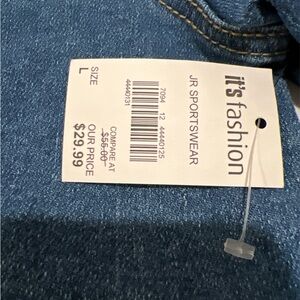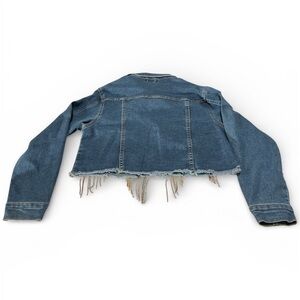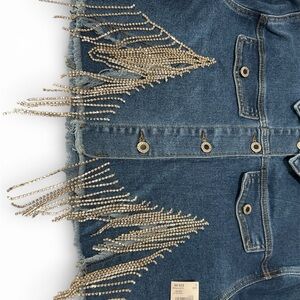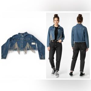 Stylish denim crop jacket featuring rhinestone fringe detail. Perfect for a trendy look.