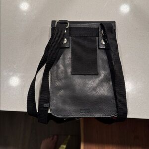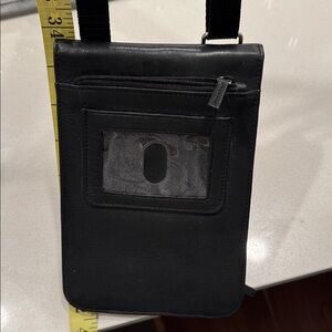 Sleek black leather crossbody bag with a clear front pocket. Perfect for everyday use.