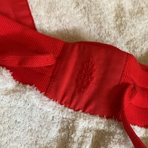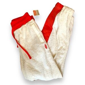 Cozy track pants with a relaxed fit. Features cream body with red accents. Perfect for casual wear.