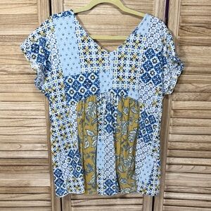 Cato Patchwork Floral Green Blue Yellow Rust V-Neck Cap Sleeve Top Size L