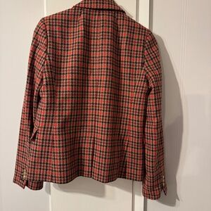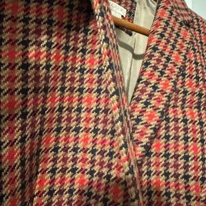 Thick blazer with a houndstooth design. The gold buttons elevate the look. Multiple shades of brown, red, and a bit of black make it standout but not too busy.
