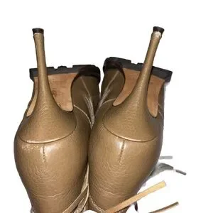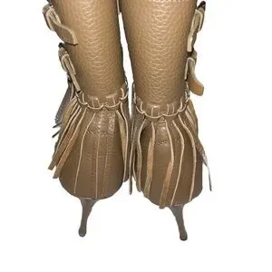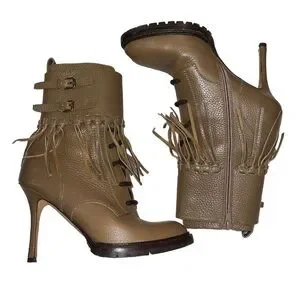 -details: brown fringe moto boot with lug sole and stiletto heel, lace up and two buckle closure