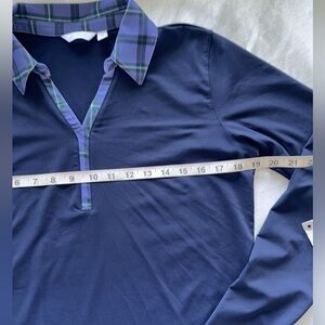 Women's Clubhouse Plaid Collar Long Sleeve Golf Polo Shirt in dark navy, size medium. This polo shirt features a plaid pattern on the collar and a long-sleeve design, suitable for golf or casual wear. Lady Hagen is known for stylish and functional golf apparel for women, designed for comfort and performance on and off the course. The shirt is made with Hydro-Dri technology to keep the wearer cool and comfortable. Long sleeve polo shirts are versatile and can be paired with jackets or sweaters for added warmth or worn alone for a sophisticated look. Moisture wicking breathability wrinkle resistant, UPF 50+, approximate measurements in pics. Excellent condition.