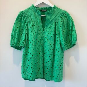 Women's Kelly Green Summer Casual Top Puff Short Sleeve Eyelet Trad Wife Brunch