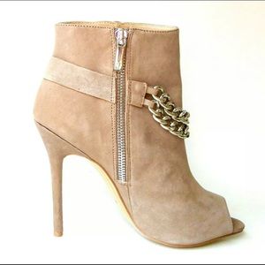 Charles Jourdan Cary Taupe Suede Chain Ankle Booties Peep Toes Heel Shoes 5 1/2