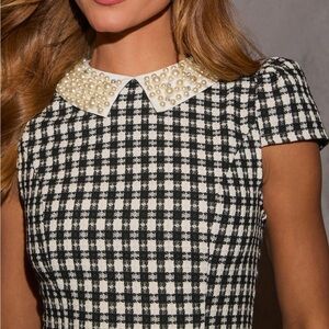 Elegant mini dress with houndstooth pattern. Features a cream collar. Ideal for chic outings.