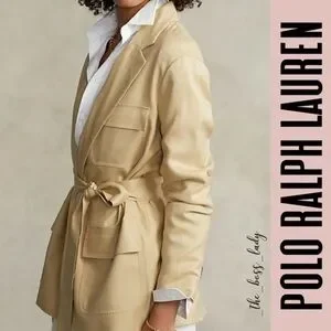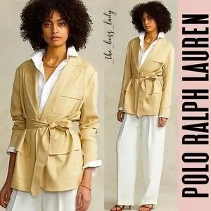 Stylish tan blazer with a belt. Features multiple pockets. Perfect for a chic look.