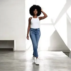 - These retro style jeans feature a straight leg, cropped ankle length (perfect for cuffing!), and a fitted hip & thigh. Embroidered flowers decorate the front thighs, and a high rise makes these jeans very comfortable. Zip & button closure.