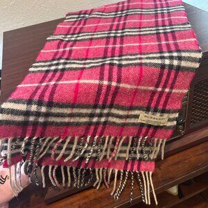 Burberry Lambswool Stole, Pink/Fuchsia Plaid Print, Fringe Edges.