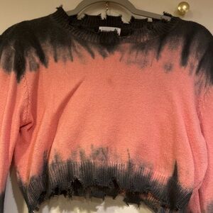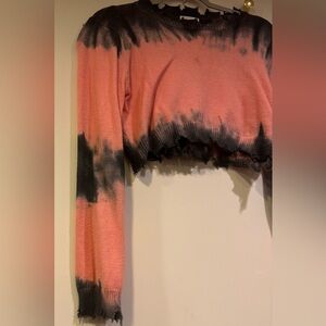 Intentionally distressed areas with pink and black tie-dye design. Midweight knit fabric. Excellent condition. Sold out online. Darker Pink than online photos.