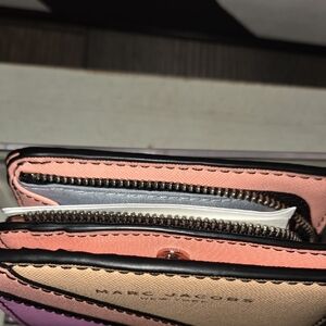 Elegant Marc Jacobs wallet with pink and tan stripes. Compact and stylish.