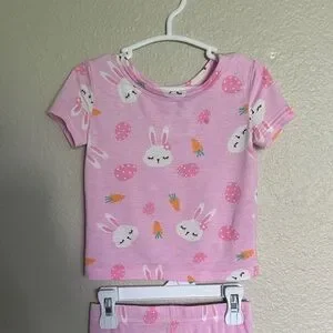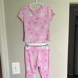 Delightful pink pajama set featuring playful bunny and carrot designs. Ideal for a snug and comfortable sleep.