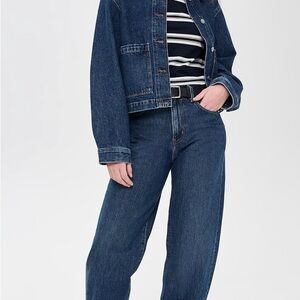 Classic blue jean jacket. Button-up front. Two front pockets. Stylish and versatile.