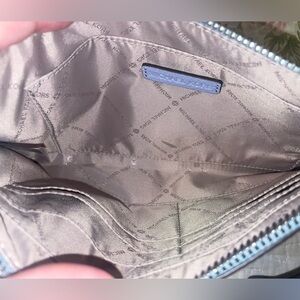 Elegant MK light blue/gray clutch. This wristlet is very spacious with several cardholder slots inside making it the Perfect addition for on the go!