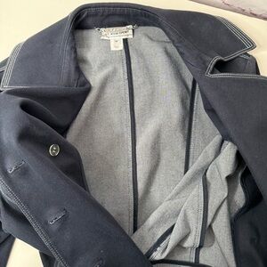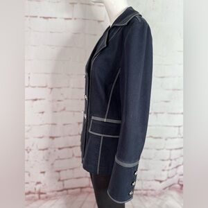 White stitching on Navy Blue cotton blend blazer by St. John Sport. 2 deep front pockets.