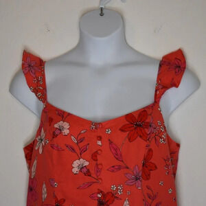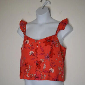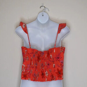 Pre-owned, good condition. No visible holes or stains. Normal signs of wear. Beautiful, vibrant floral print in shades of red, pink and white over a coral background. Corset style. Faux button front detail. Smocked back. Cropped. Adjustable spaghetti straps with ruffle detail. Perfect to wear with jeans, shorts or a skirt. Fully lined. Size per tag: XL (Extra Large). SL Strappy But Boho Baby Floral Warm. Fabric: Shell: 55% Linen/ 45% Cotton. Lining: 100% Cotton. Please see pictures for measurements. Please note top length measurement was taken with straps extended to the max.