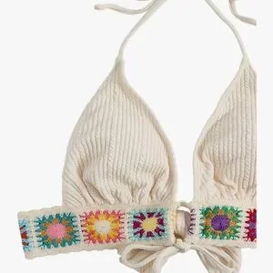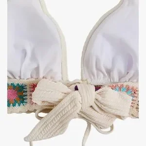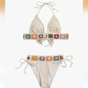Embrace summer vibes with this stylish bikini featuring a colorful crochet trim. Perfect for beach days and poolside lounging.