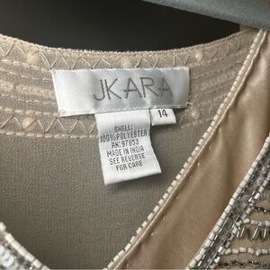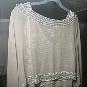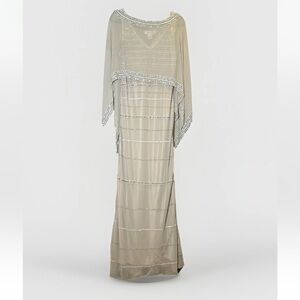 Stunning beige maxi dress with intricate beadwork. Perfect for elegant events. Comes with beaded sheer cape, can be worn without. Bust 40”, length 60”