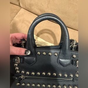 Elevate your style with this elegant edgy black and tan satchel featuring chic studded details. Comes w removable strap . Light signs of wear inside , small scuff on handle.