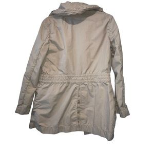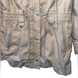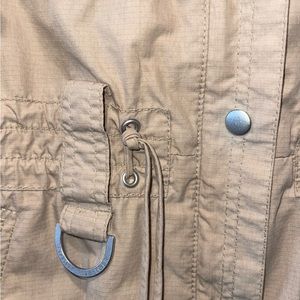 This is a Tommy Hilfiger Field jacket in tan. It has a zipper front and snap front as well. Multiple pockets with snap closed flaps and zipper side pockets. It has a white collar with a drawstring. The fabric is a ripstop fabric. This jacket is an excellent condition.