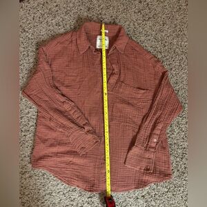 Burnt orange/brown two piece set including long sleeve crepe button up shirt (oversized fit) and wide leg pants with elastic waist