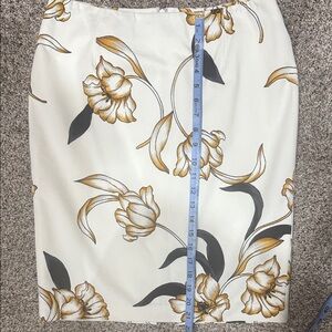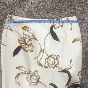 New with tags women’s floral pencil skirt, size 6. Elegant cream base with black and gold floral print for a chic, elevated look. Classic straight/pencil silhouette that works for office, events, or dressy everyday wear.