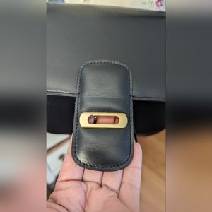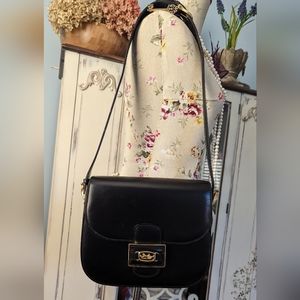 This is a beautiful vintage Celine box shoulder bag with gold hardware. Made from smooth black leather and features the classic horse and cart hardware design on the front closure, revealing the word CELINE underneath the clasp.