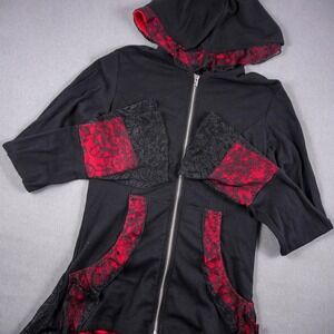 Unleash your inner rebel with this striking Tripp NYC hoodie jacket. The captivating black exterior is beautifully contrasted by vibrant red lace accents that peek through the pockets, bell sleeves, and hood lining, creating a dramatic and alluring effect. A detailed lace-up corset back cinches the waist, offering a flattering and customizable fit, while the asymmetrical lace hemline adds a touch of gothic elegance. This piece is perfect for making a statement at a concert, a night out, or any occasion where you want to showcase your unique style.