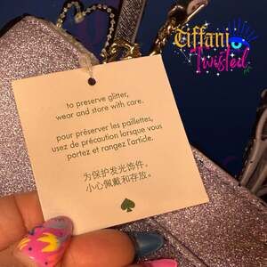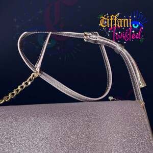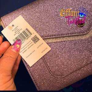 Brand new with tags Kate Spade glitter envelope-style crossbody bag in a lavender pink shimmer finish. Features a structured flap silhouette with snap closure, gold-tone hardware, and an adjustable strap with chain detail. Interior includes card slots and a zip pocket for organization.