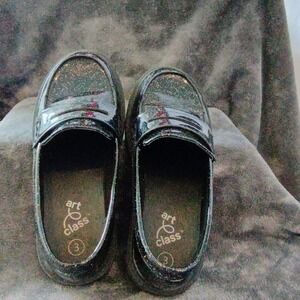 The product is a pair of Art Class Celia Glitter Slip-On Loafers in Black Onyx, designed for girls in size 3. These stylish loafers feature a round toe shape, low heel height with approximately 2.25 inches block heel, and are made of faux leather material with glitter accents. The slip-on closure and medium shoe width make them easy and comfortable to wear, perfect for any young girl looking to add a touch of art-inspired glam to her outfit.
