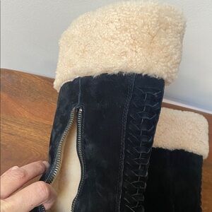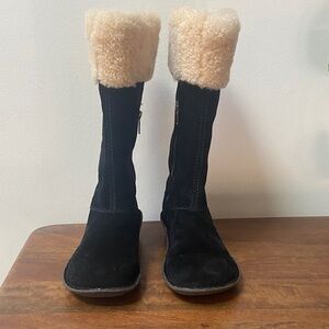 Elegant UGG boots with black suede exterior. Cozy tan shearling lining. Sturdy sole for winter wear. In like new condition-runs smaller for a size 8