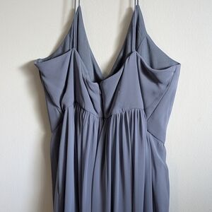 This sophisticated gray sundress by Dessy Collection showcases a stylish wrap design with a plunging neckline and delicate spaghetti straps. Ideal for cocktail occasions, the dress is sleeveless and crafted from a lightweight, flowy fabric that offers a graceful silhouette. Its elegant style makes it a perfect choice for a wedding guest. please note: couple tiny pulls in bottom fabric, sold as is.