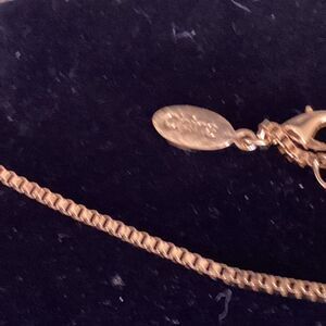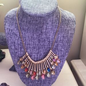 Adjustable LOGO brand goldtone necklace features a box chain strung with 23 paddles with faux crystals of golds, greens, pinks and blues. It can be worn from 20” length to 23” with the extension chain included. Showing photos of the front and back sides for your review.