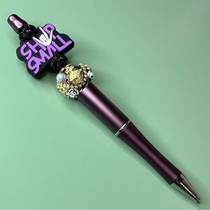 Handmade beaded pen featuring a focal bead that says “Shop Small” in purple letters. The “O” in Shop is a skeleton hand, adding a touch of gothic flair. This pen also features a fancy bead with intricate decorative elements, including a dainty dangling star charm, giving it a unique galactic vibe.
