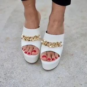 Women's White Patent Platform Mules Stiletto Heels Gold Chain Accent