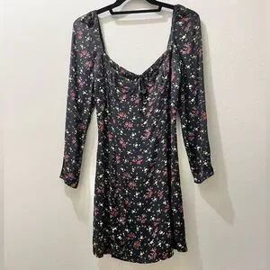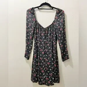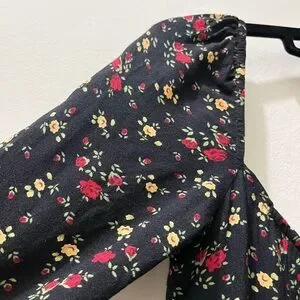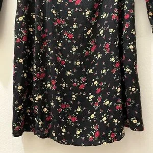 Black long-sleeved minidress with red, yellow, and green floral print by Reformation, size 6. Great used condition and freshly cleaned. Elastic neckline. Slightly puffed sleeves. Back zipper. Please, NO RETURNS. Questions/offers welcome!